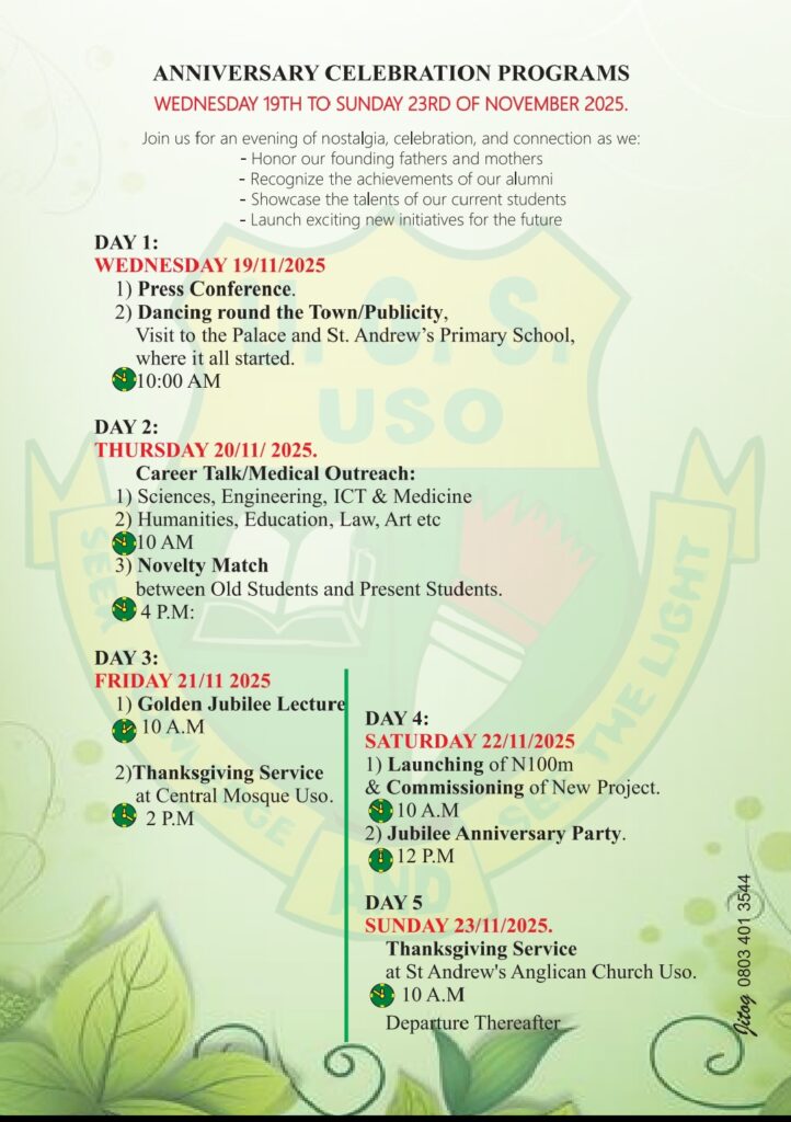 The Old Students Association of Uso Grammar School, Uso, is set to roll out the drums for a landmark celebration as the institution marks 50 years of academic excellence, community impact, and alumni achievements. The Golden Jubilee Celebration, scheduled for November 19–23, 2025, will also feature the formal launching of a ₦100 million School Building Project aimed at upgrading facilities and expanding learning infrastructure.