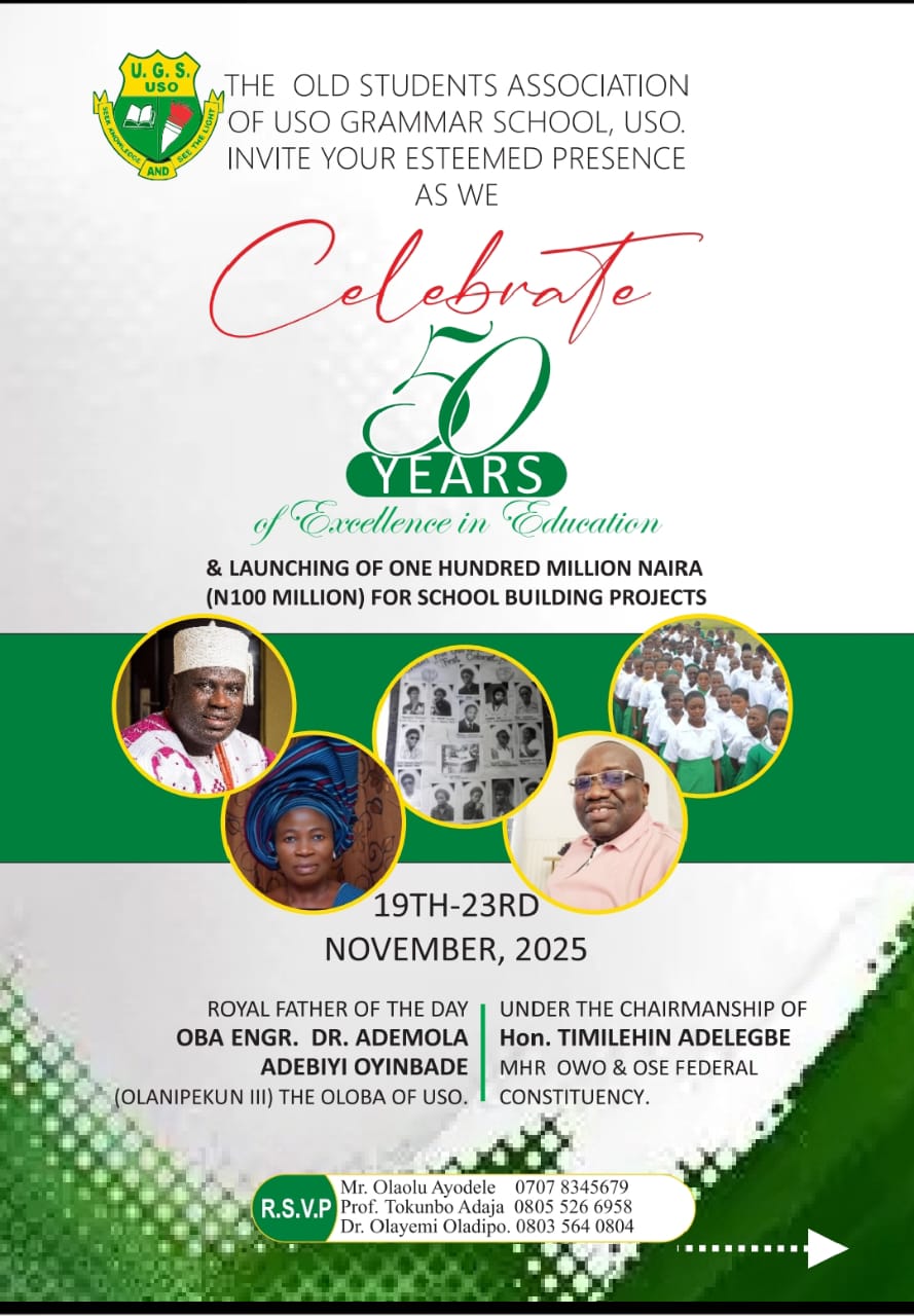 The Old Students Association of Uso Grammar School, Uso, is set to roll out the drums for a landmark celebration as the institution marks 50 years of academic excellence, community impact, and alumni achievements. The Golden Jubilee Celebration, scheduled for November 19–23, 2025, will also feature the formal launching of a ₦100 million School Building Project aimed at upgrading facilities and expanding learning infrastructure.